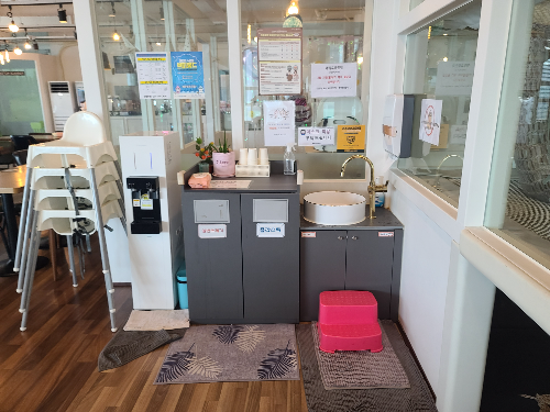 그리고 이렇게 정수기, 쓰레기통, 손 씻을 수 있는 공간과